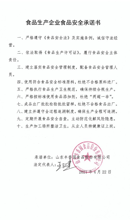 食品生產企業食品安全承諾書